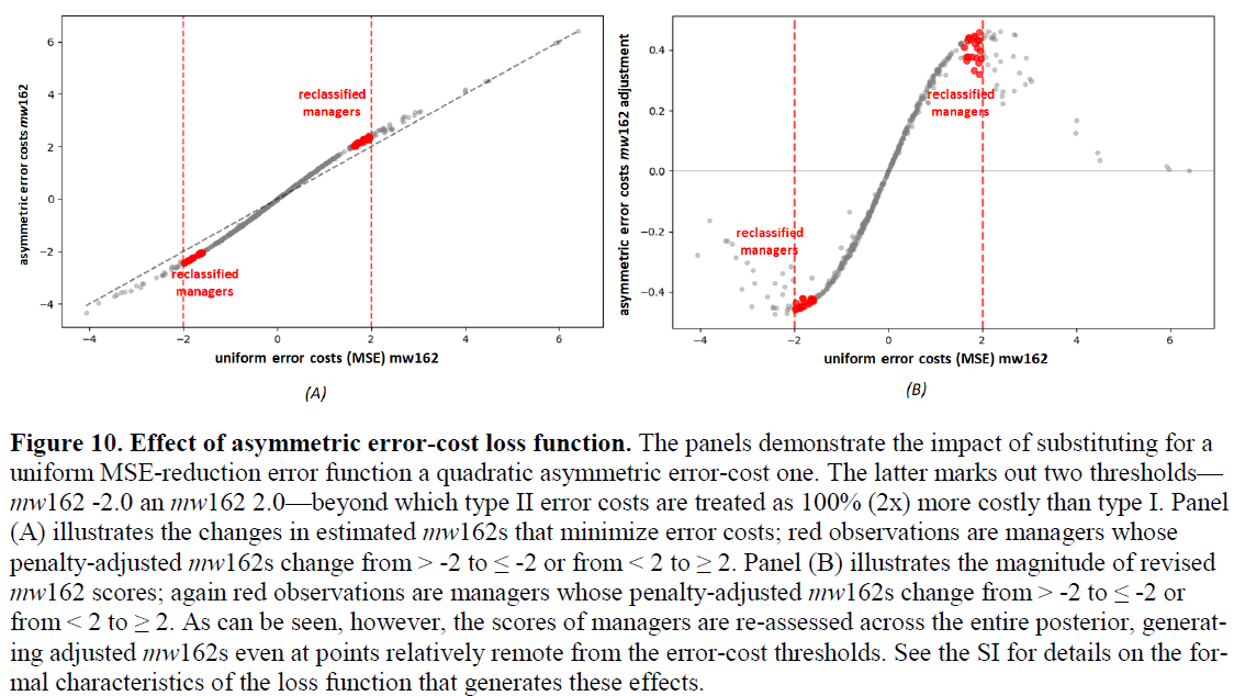 If you plug these asymmetric preferences into the Estimator, it will recalculate the mw162 of every manager, replacing his MAP estimate with a loss-adjusted one that minimizes the specified error costs of hiring or retaining any particular manager.