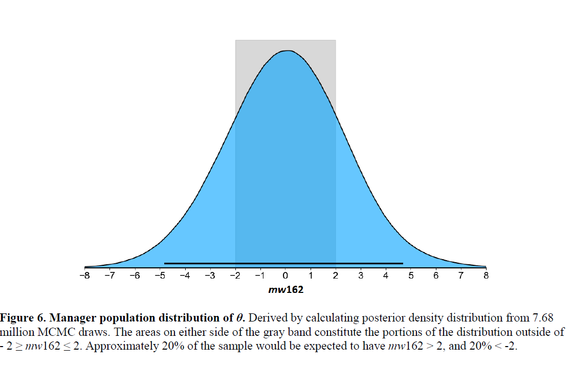 Only about 10% of managers can be identified by the Estimator has possessing a so-called MAP—or maximum a posteriori or most probable estimated value—of |mw162| ≥ 2.0. But because the Estimator is able to determine that there are many who have a non-zero probability of that level of proficiency, it can also estimate a population level incidence of it. That turns out to be 40%!