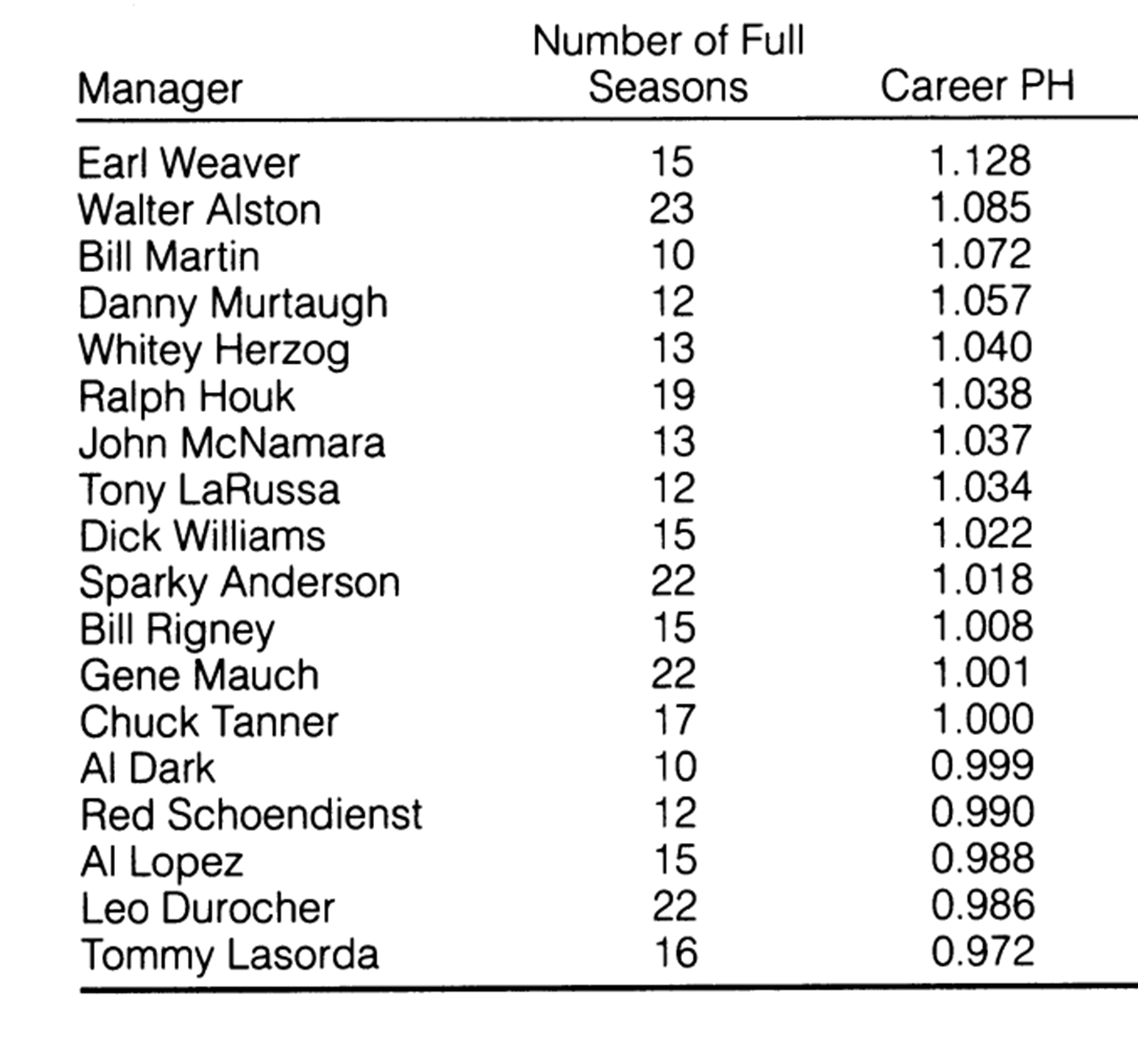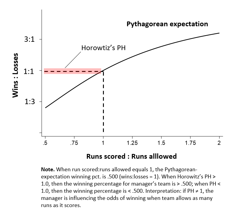 Now imagine that we fit a regression model to a manager’s career record, treating each season as a separate observation, and found . . . PH > 1! According to Horowitz, that would mean a manager’s skill had bent the Pythagorean-expectation curve, generating an expected win pct greater than .500 in seasons in which his team allows as many runs as his team scores! By the same token if PH < 1, then the manager’s ineptitude was dooming his team to a losing record despite scoring just as many runs as its opponents.