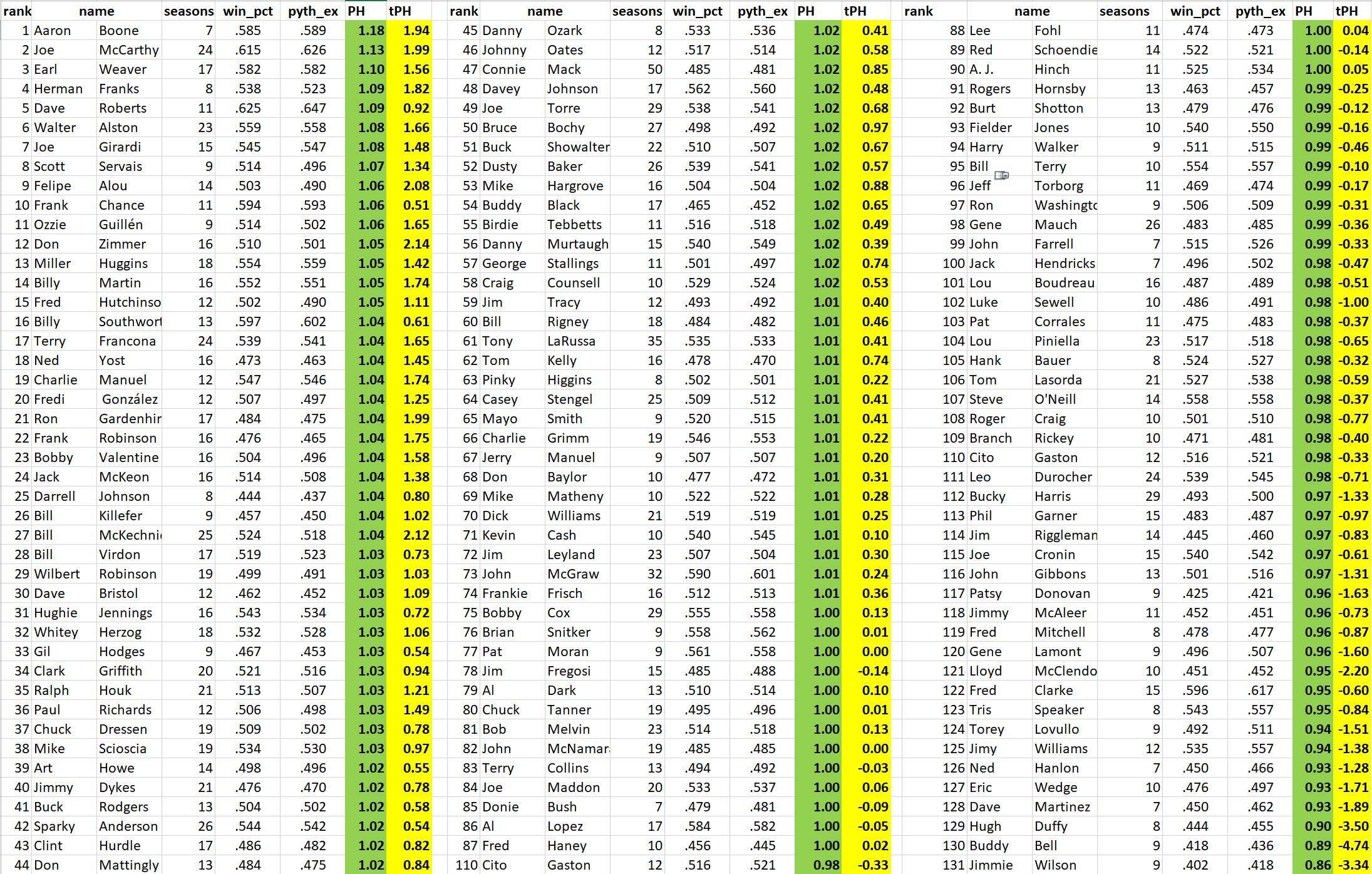 Of course, runs scored and runs allowed are going to occur in irregular patterns over finite samples; that’s why Pythagorean expectation doesn’t perfectly explain team wins and losses in a season (it usually explains about 90% of the variance in team W/L records). So if PH ≠1, that just means that over the course of a manger’s career, the distribution of runs scored and runs allowed was either a lot smoother than normal (PH > 1, because no runs scored were “wasted”) or more lopsided than normal (PH < 1; “blowouts” squandered runs that should have been saved for later contests where they’d mean more)–all as a result of chance, not managerial skill