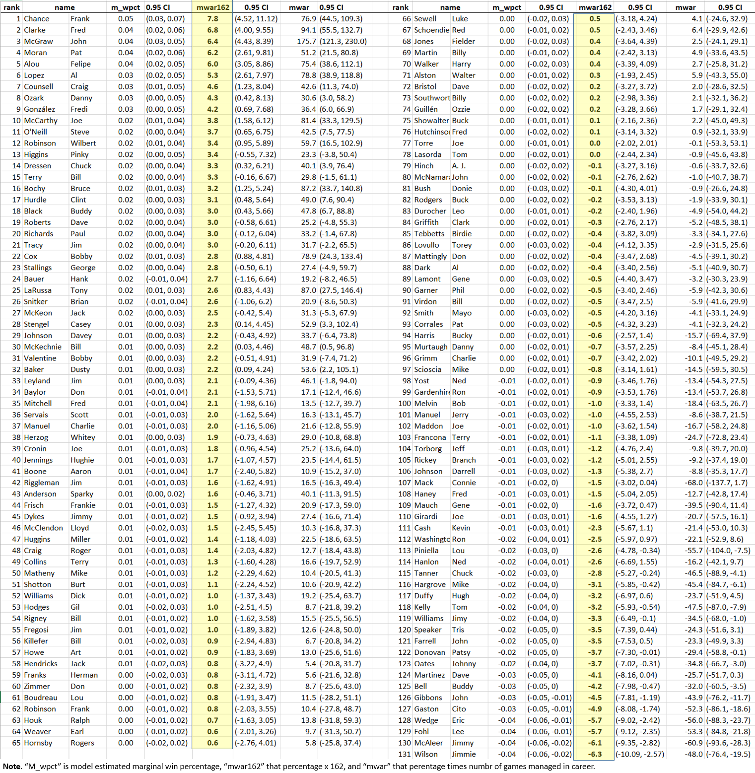 If we multiply this marginal winning percentage by games managed, we know how many “extra wins” a manager is responsible for over the course of his career. That’s his MWAR!